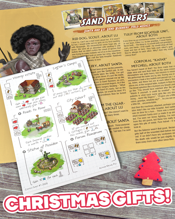 For Christmas and New Year we have for you two awesome gifts. We prepared for you thematic plot board for Sand Runners with additional (non-tournament) rules. Additionally, our fan Michał Pilc created new promo sheet for IS: Roll & Write.