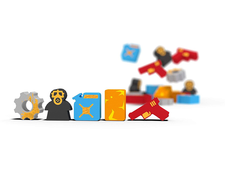 A set of wooden markers representing Bricks, Guns, Fuel, Iron, and Workers. The markers are custom shaped and engraved with details giving them a one-of-a-kind finish.