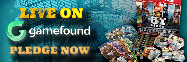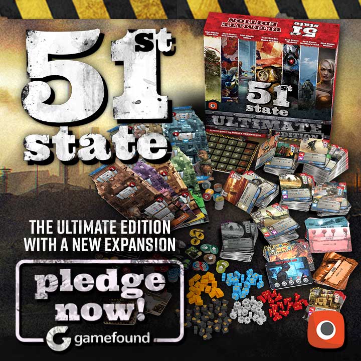The new expansion gives 51st State a completely new dimension by introducing an area control mechanism that increases player interaction. The new game area allows players to build their bases and outposts in order to gain advantages, resources and Victory Points. Pledge includes:
