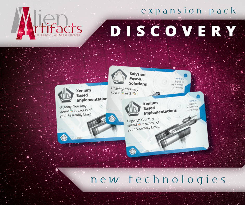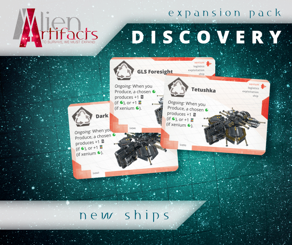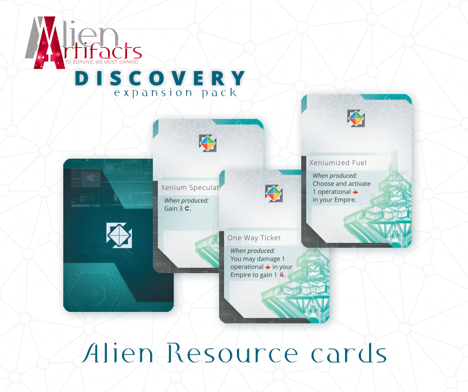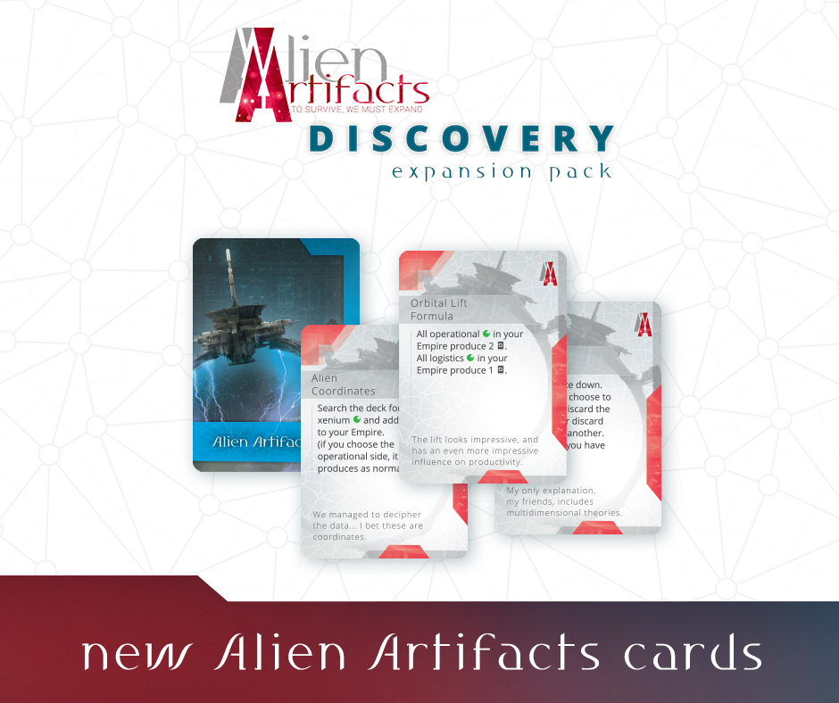The Discovery expansion for Alien Artifacts moves forward the storyline of the universe and introduces new cards – along with a completely new type of cards, Alien Resources. Get new ships and new technologies and send your research vessels into uncharted space. Explore the galaxy for anything — or anyone — you can exploit.