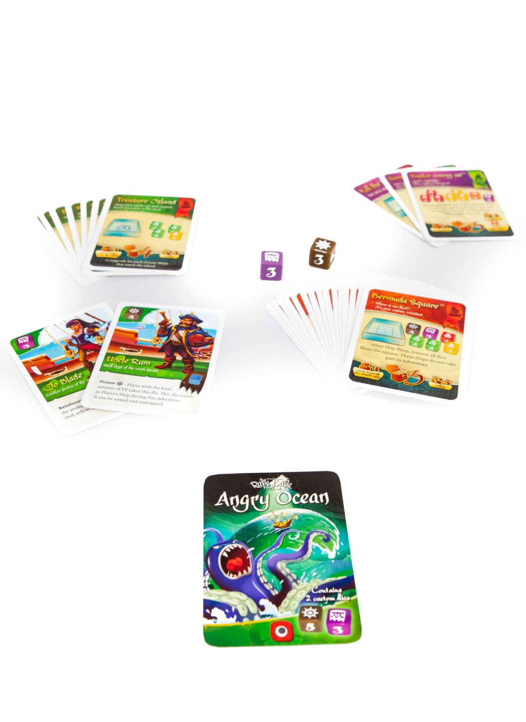 Angry Ocean, is the first scenario expansion for Rattle, Battle, Grab the Loot. This expansion adds two new scenarios: Old Dogs, and Angry Ocean. Old Dogs weaves a tale of near-retirement pirates, out for one last voyage. The scenario begins with a draft in which players build their ships with upgrades. Afterwards, no further upgrades are available and the players compete for fame and fortune over a series of 4 adventures. The Angry Ocean scenario is a standard, 5 adventure scenario that is anything but standard. The ocean is fighting back with everything it has. Storms, sea monsters, rocks, and certainly other pirates will all be challenging you to hold on to your gold.
