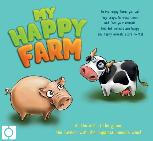 In My Happy Farm, the players must purchase, plant, and harvest crops in order to feed their animals and make them happy. Each turn, the players may only take 2 actions, and some plants take multiple turns to fully grow. The players must time their planting and harvesting to maximize their potential to feed their animals. There are a limited number of feeding cards available, so the players must be careful or someone else may purchase the cards first!