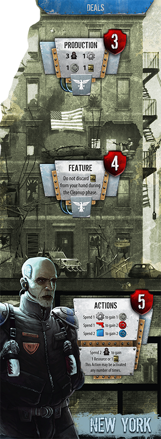 New York produces Iron, the major resource of building. From the very first turn, New York can build 2 new Locations at Distance 1 or one Location a little farther away (Distance 2). They struggle to Raze and Deal, however. They aren’t immediately able to Deal and Raze locations at Distance 3. It’ll take a bit more effort to reach these powerful locations.