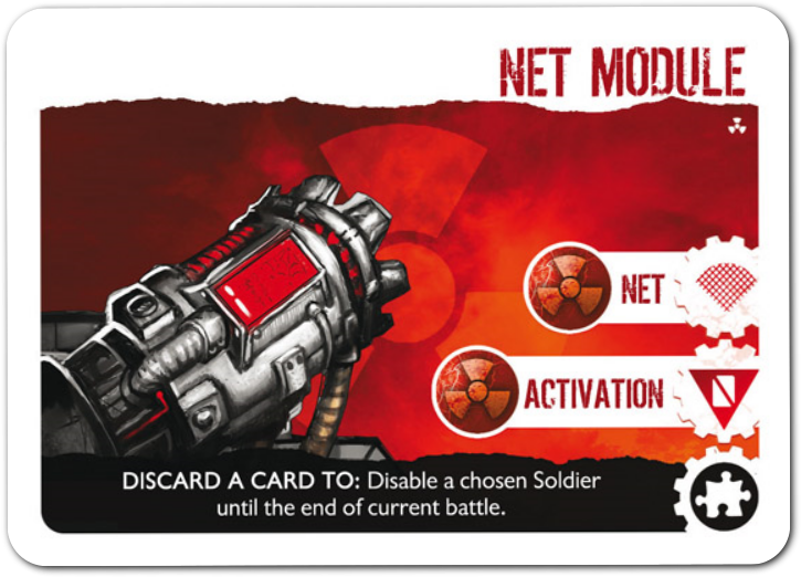 net-moduleLastly, the Net Module. Nets are an important part of the Neuroshima world. They allow you to disable a unit. In Convoy, this ability is HUGE. So, we make you discard a card to use it. Don’t let that discourage you, however. Losing 1 card to win a city is completely worth it. If you lose, you will have to discard multiple cards from your deck, which means you don’t get a choice. This also shuts down the unit’s ability, so you may get even more value.