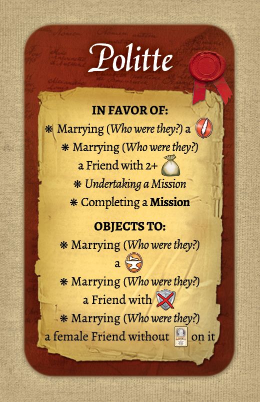 Family cards contain information about what that family likes and dislikes. They will have impact on the available actions that we can take. For instance, let’s take a look at the family of artists, Jolie. Like most artists they like: parties (New Relations), new palaces (Property), and weddings (Marriage or Arrange Marriage with an artist). On the other hand, she really dislikes: those lousy aristocrats (Marriage or Arrange Marriage with an aristocrat), hard work (Enterprise), and people who work too much (give an additional pawn).