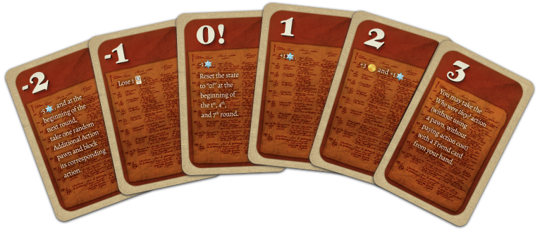 By taking any of these actions, you will raise or lower the acceptance level of these families. To keep track of the current level, you will use a new set of cards displayed in a fan. The highest level will allow you to take a Marriage action for free. It’s like you have 2 people madly in love with each other in both families, yours and the Parisians. On the other hand, if you let the level of acceptance drop really low…. you will have to face the consequences.