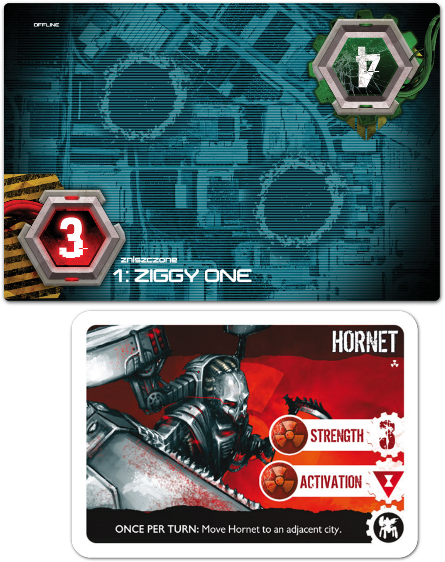 Granted, this rule is early in the rulebook, but it’s an important one. Take our friend the Hornet over there. He’s been left behind in Ziggy One as the convoy marched forward. Normally, Hornet likes to be right in the thick of battle. He can jump around each turn between locations… BUT… he is in a Destroyed city which means he can’t use his ability!