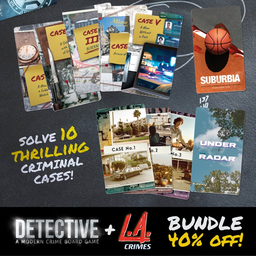We’ve got a seriously good deal for all you mystery lovers! Detective: A Modern Crime Board Game and its expansion, LA Crimes, are now available as a bundle with a 40% discount!
