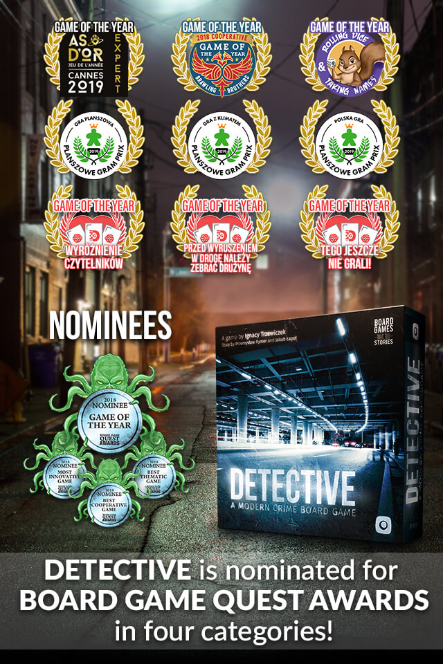 What’s more, Detective was nominated by Board Game Quest in the Best Cooperative Game, the Most Innovative Game, the Best Thematic Game and the Game of the Year categories for 2018. Thank you for that nominations – you can find more details here: