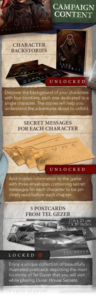 Add hidden information to the game and enhance your knowledge about Tel Gezer with 3 pre-order exclusive envelopes containing secret messages specifically created for each character. Before each of the three main chapters, players open their envelope and secretly read a detailed piece of useful information dedicated to their character. Players are free to share this information with others, or to keep it to themselves. These 3 envelopes will add another layer of theme and adventure to your experience of Dune: House Secrets. story to come.