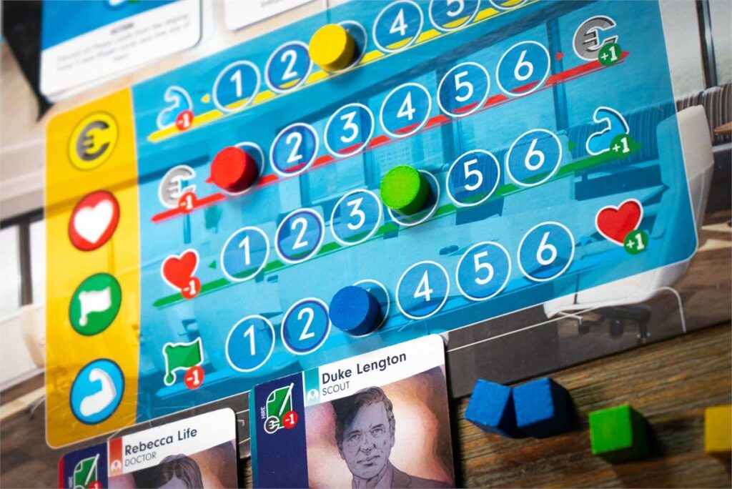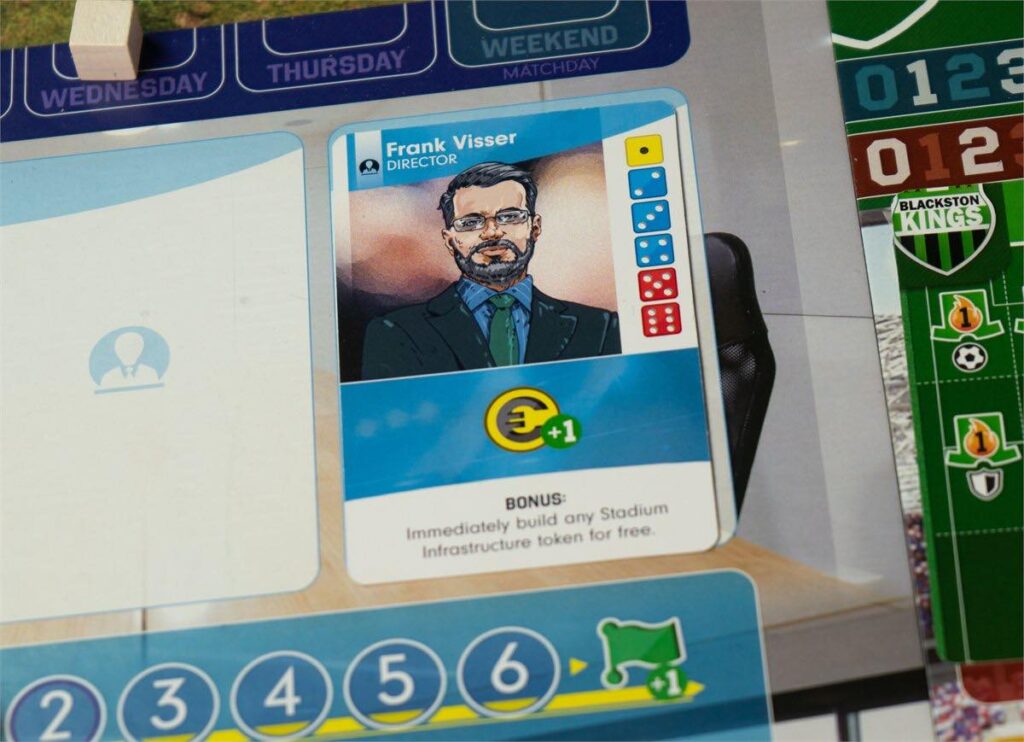 The 4 tracks on the center board, which is called the boardroom, provide you with resources: Budget, fans, operations, and fitness. At the start of each week, you gain resources according to these tracks. If your budget marker is at 3, you gain 3 Euros. If your fanbase marker is at 2, you gain 2 fans, etc. Resources drive the game.