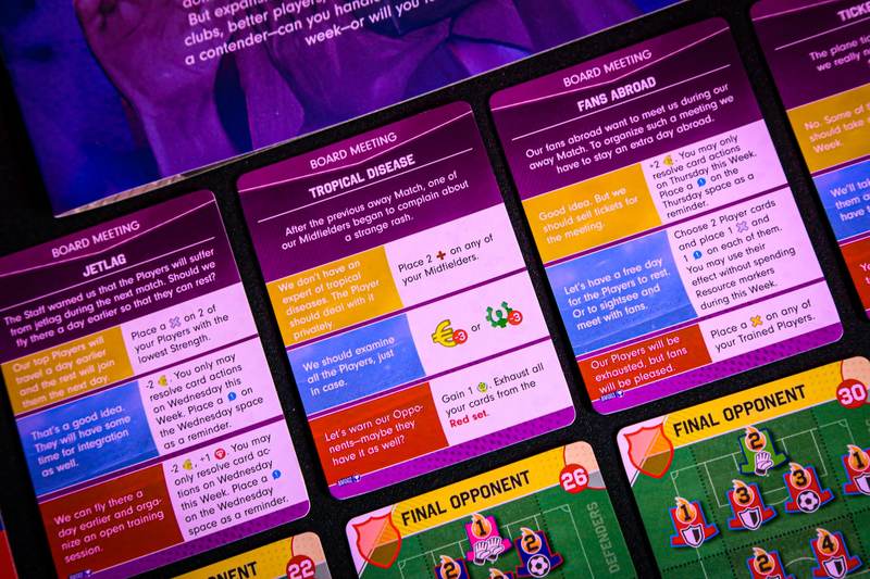 For the first two Weeks, the game does not differ from the standard game, however, starting from the third Week, you will play two matches a week – one on Wednesday and the second, traditionally, on Friday. Cup matches follow the same rules as regular matches with a few exceptions. As always, you can assign Fan Base markers to the stands, or you can normally discard Injury and Suspension tokens from your cards. At the same time, assigning a Player to a Match will not require you to spend Fitness.