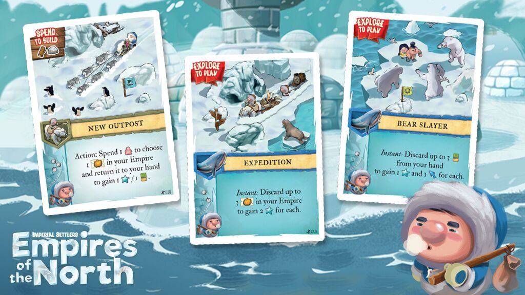 Mechanics of this deck are based on the appropriate use of Field cards, which will have to be discarded sometimes! Nanurjuk discovers the Fields, gathers their resources, and then has to abandon them, discard, gain Victory Points, and set off in search of new Fields and lands to settle.