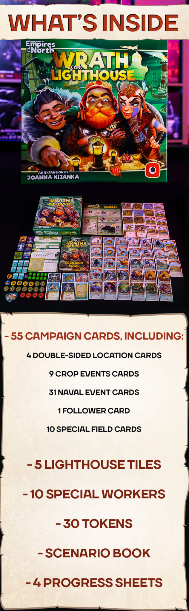 It’s time to re-enter the world of the Imperial Settlers: Empires of the North – this time in legacy mode! Empires of the North: Wrath of the Lighthouse is a story expansion to the famous strategic board game by Joanna Kijanka (Robinson Crusoe: Mystery Tales, Neuroshima HEX: Beasts). The time of unrest has come in the Kingdom. The crops are poor, the Great Temple is in ruins and the mysterious followers of the Lighthouse appear on the horizon… Become the emperor’s advisor and save your country by playing a Campaign divided into 15 epic Scenarios. Wrath of the Lighthouse is compatible with other expansions, so you will be able to complete the campaign multiple times, each time playing as a different Clan!
