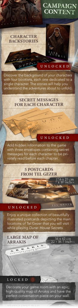 Experience Tel Gezer with a unique pre-order exclusive collection of 5 large (17.6 x 25 cm / 7 x 10 inches) postcards that reveal primary locations you’ll be visiting in Tel Gezer while playing Dune: House Secrets. These beautifully illustrated postcards are a great compliment to your experience, can be used