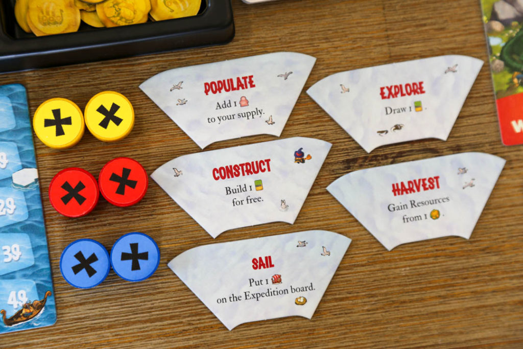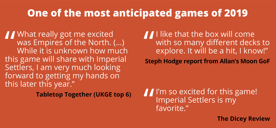 Imperial Settlers: Empires of the North is a card game in which players lead one of six clans from three different factions. The game plays out over a series of rounds, during which players explore new lands, construct buildings, trade resources, and sail to new lands with the aim of either