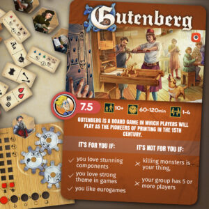 Gutenberg releases in June. We already launched the website for the game with the product gallery, description, and the rulebook. The game is on pre-order now and our fans can order it from our website with unique promo expansion and free shipping. Learn more HERE.