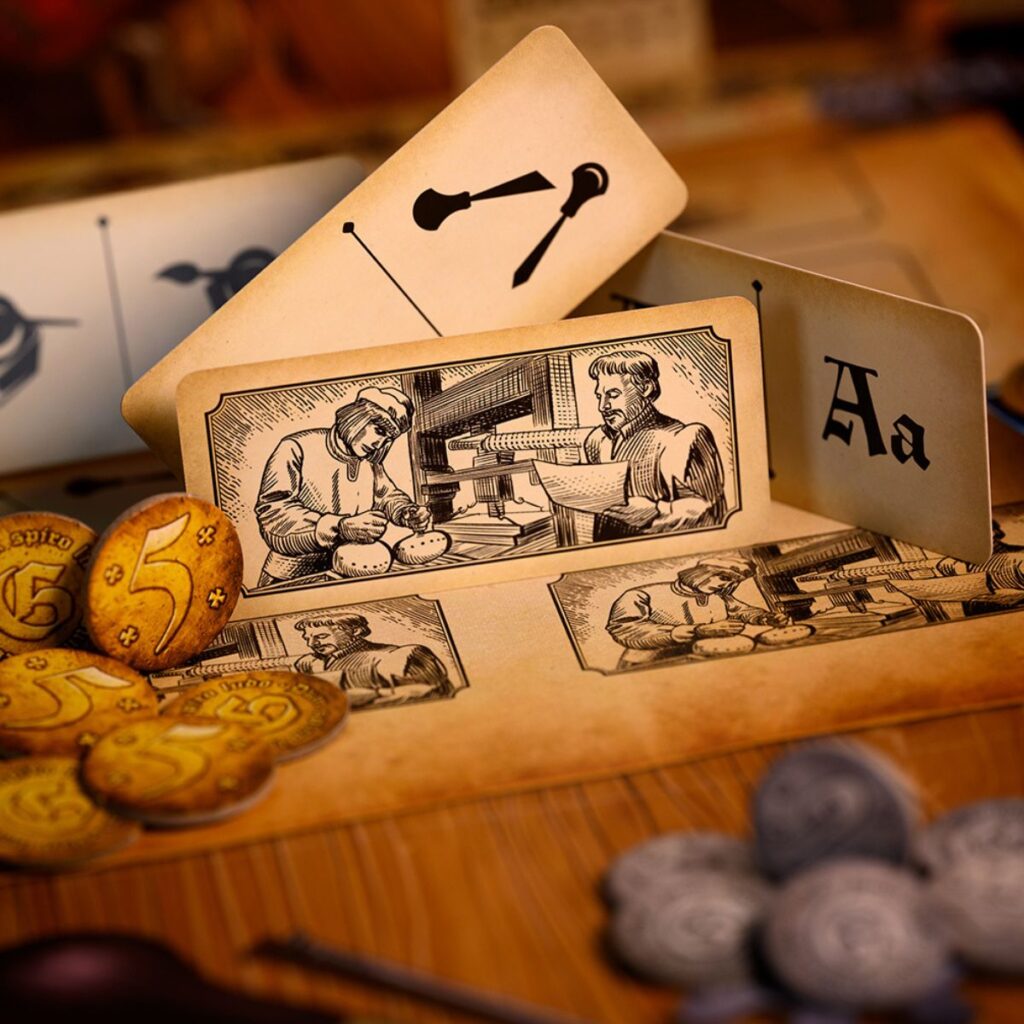 Gutenberg is a board game for 1-4 players who take on the role of printing pioneers. During the game, they will acquire and fulfill orders for valuable volumes, develop their specialties, improve their printing houses, and obtain the support of a powerful patron. Through these actions, players will earn fame points, which will determine the winner. How is the gameplay going?