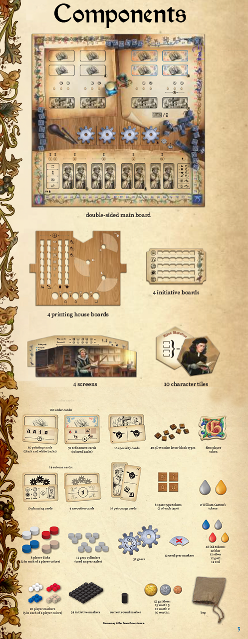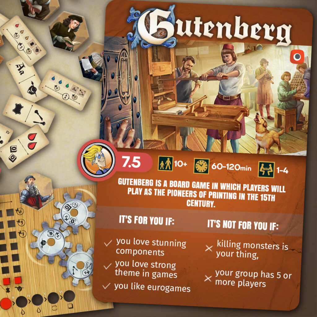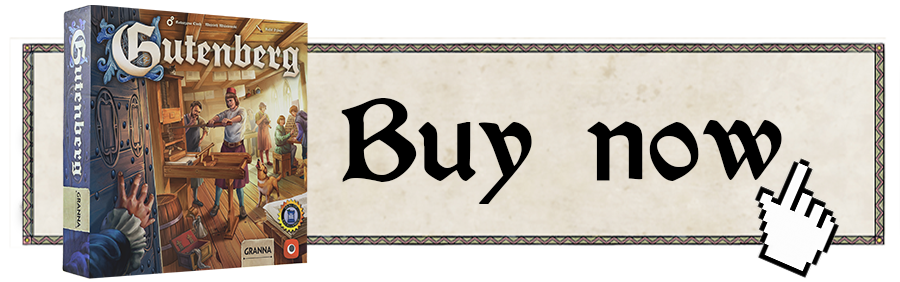 Gutenberg is a mid-weight strategy game taking place in Europe in the 15th century. Each player takes the role of the printing pioneer trying to build their wealth and fame by developing their production capacity and gaining the support of patrons. Through bidding for specific actions the players develop their printing workshops and acquire new fonts, inks, and decorations. The unique system of rotating gears allows players to combine bonuses and earn large amounts of points. The game lasts six rounds and the player with the most points at the end wins.