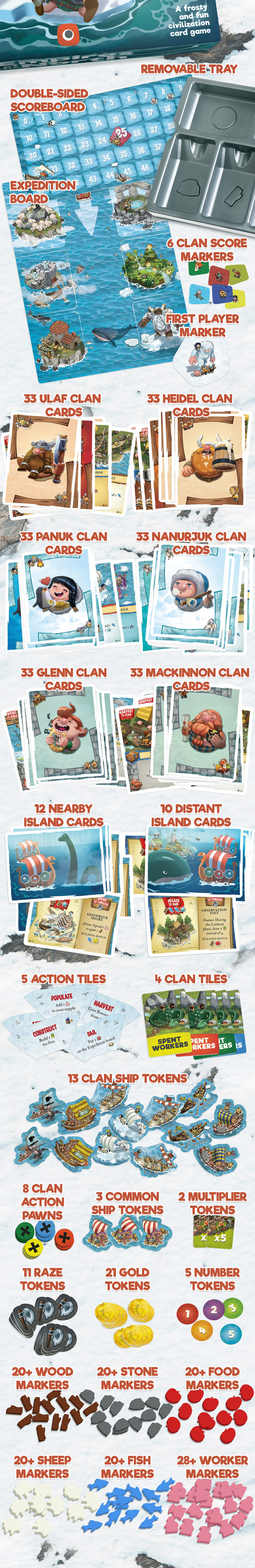 Empires of the North is a card game in which players lead one of six clans from three different factions. The game plays out over a series of rounds, during which players explore new lands, construct buildings, trade resources, and sail to new lands with the aim of either conquering, or pillaging to gain more goods! Each action draws the clans closer to becoming the greatest empire! The game ends in the same round that any player reaches the 25 victory points mark.