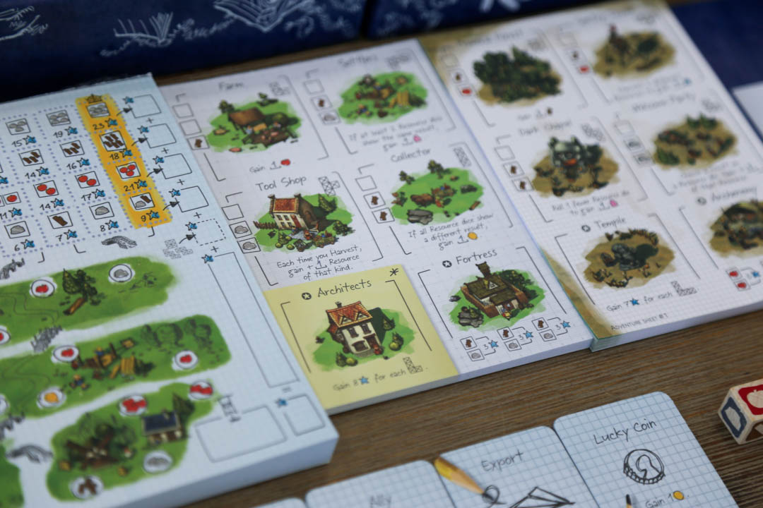 Adventure mode – designed to play solo. It offers 48 unique Village sheets – all with different buildings – so each time you play, you are challenged with a different situation.