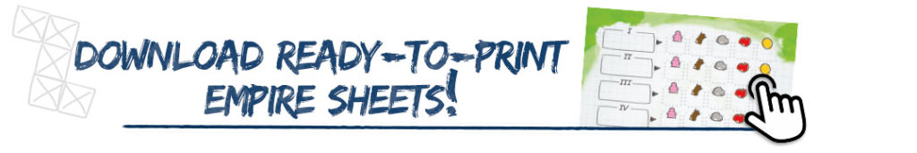 The game lasts 10 rounds. In each round player rolls 3 resource dice and a worker die, to form a shared resource and worker pool. Then each player chooses a favor token which grants their Empire a special bonus. Next, they expand their Empire by harvesting fields to get more resources, building buildings to gain new abilities, and creating various constructions to gain victory points. At the end of 10th round players count up all of Victory Points to determine the winner!