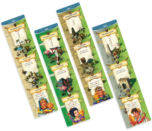 Why dozen and not 10 or 16? Well, Imperial Settlers is one of those Portal games, that has spread around the world far and wide. There are currently twelve editions and each card represents one of them. What’s more important, each card has its own, unique artwork, that illustrates small villages in a distinct architectural style characteristic to each represented country.