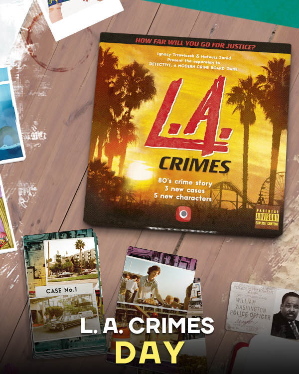L.A. Crimes is the first expansion for Detective: A Modern Crime Board Game. Visit California and delve into sunny streets of 1980s Los Angeles. In L.A. Crimes you can break the law for example by breaking into the household without warrant, find more evidence. Beware, committing a crime under the careful eye of higher-ups will stress you out. You can also send your colleagues to observe certain suspects, so a few hours later you can maybe get useful info about them.