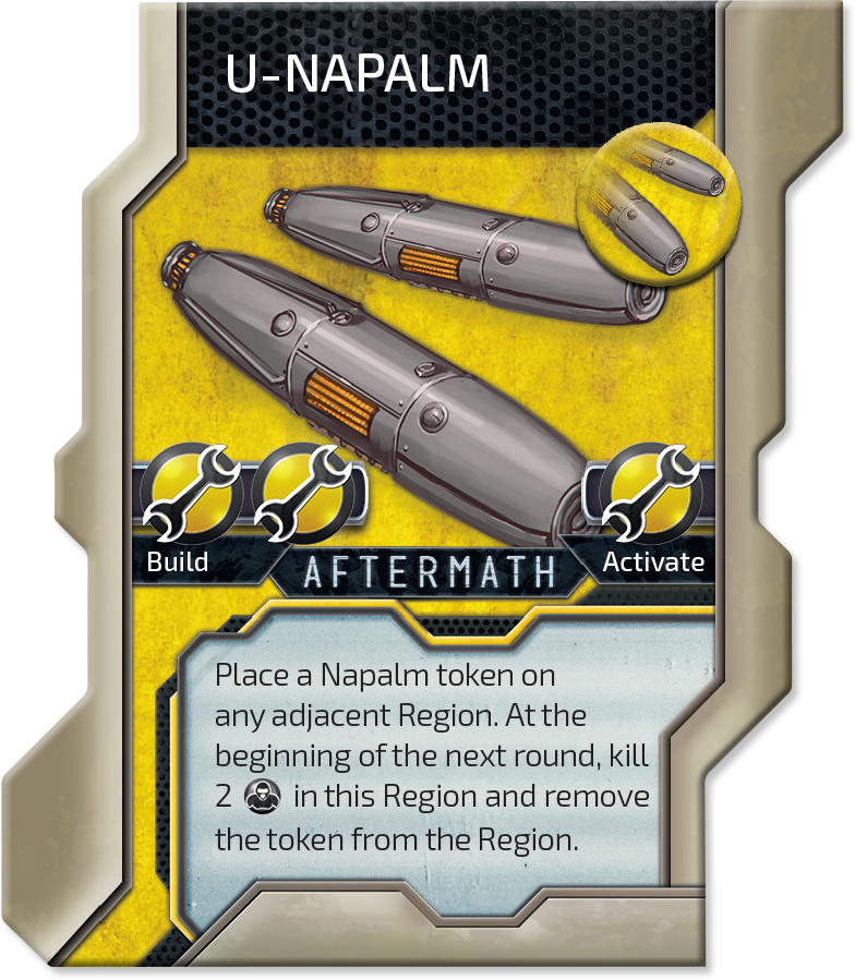 And speaking of obstacles… U-NAPALM is a structure that just removes stuff. You dump it in any adjacent Region and next round 2 Units are removed from the area. Nice and smooth. Insane flexibility and some napalm. How cool is that?