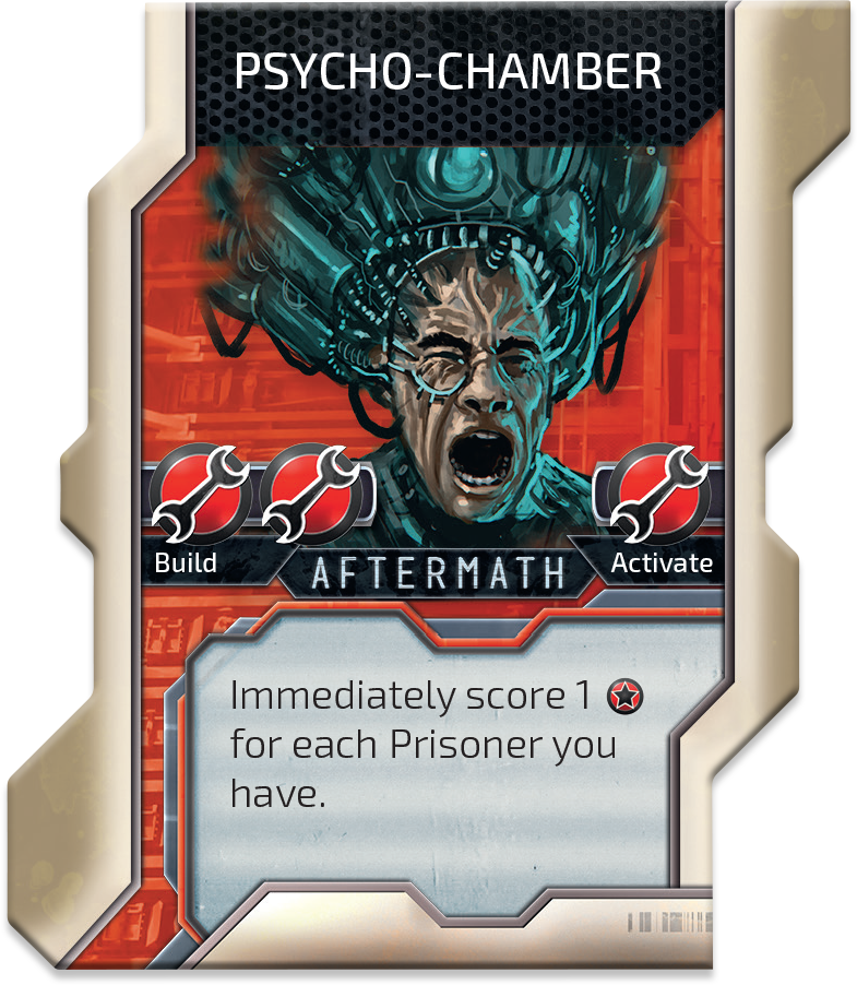 Let’s start with PSYCHO-CHAMBER, because it is dreadful and because it changes the way Machines operate. Instead of killing everybody in your sight, you’ll take prisoners, plug all the crazy wires in their heads and do some mean things, scoring each prisoner. Get 3 prisoners, build three Psycho-chambers, activate it three times in a round…. Got the picture?