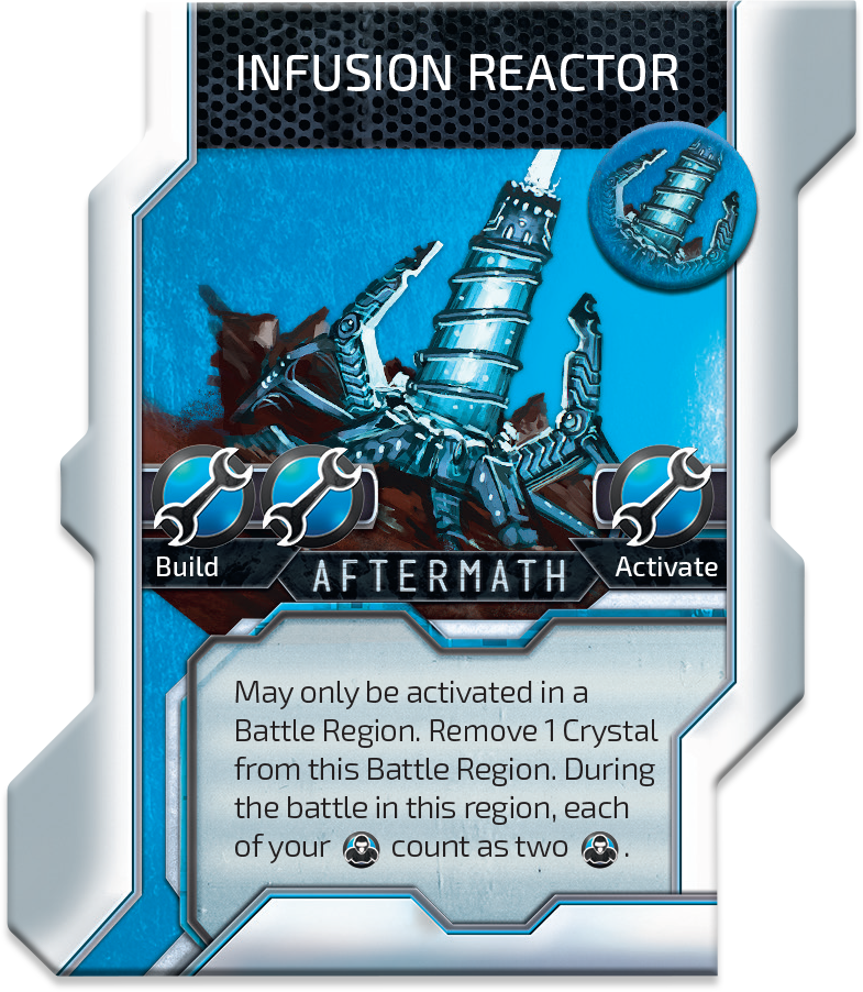 The next structure helps you with turtling because we heard Pilgrims like turtles. INFUSION REACTOR allows them to remove 1 Crystal from the Region and treat each Pilgrim Unit as 2 Units in the Battle resolution. They really can defend rich in Crystals Regions!