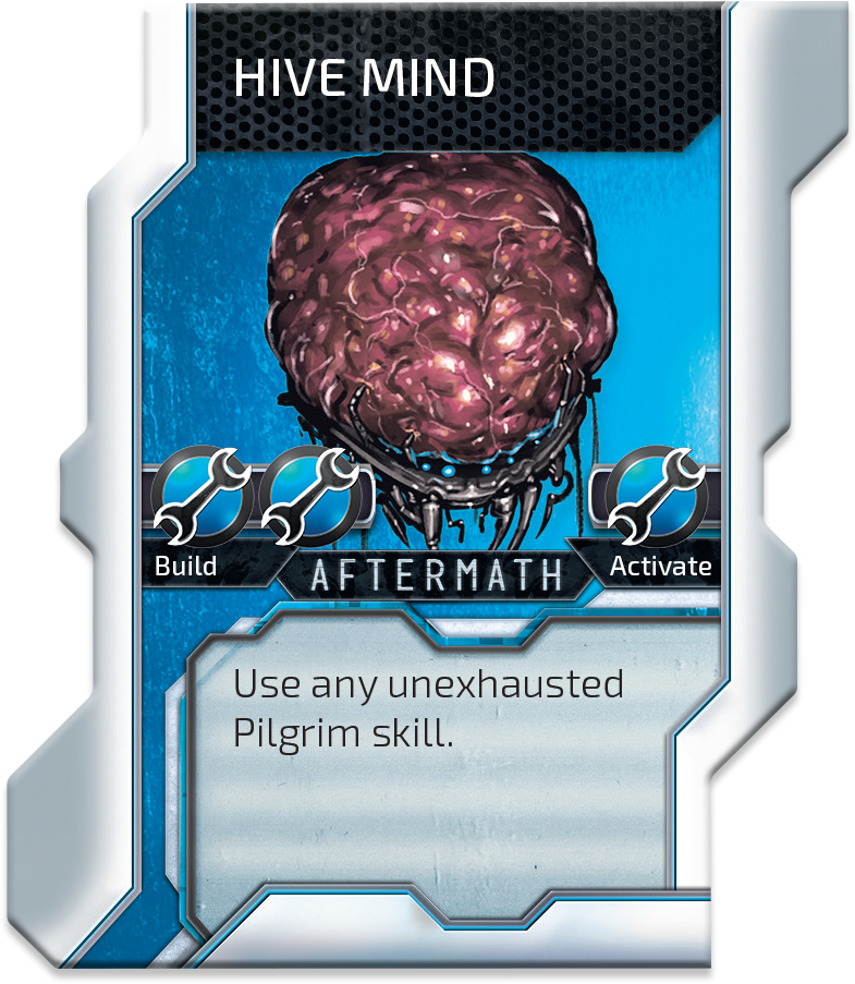 Our aliens got some new tricks as well. Let’s start with HIVE MIND. It let you use any Pilgrim skill. Any means any. The one in the box, you removed from the game? Yes, that one too. With Hive mind Pilgrims get access to all 10 skills in the game (5 from the base game and 5 from Aftermath expansion) and with that ability, they can do real magic. Your imagination limits you to create the most insane combos.