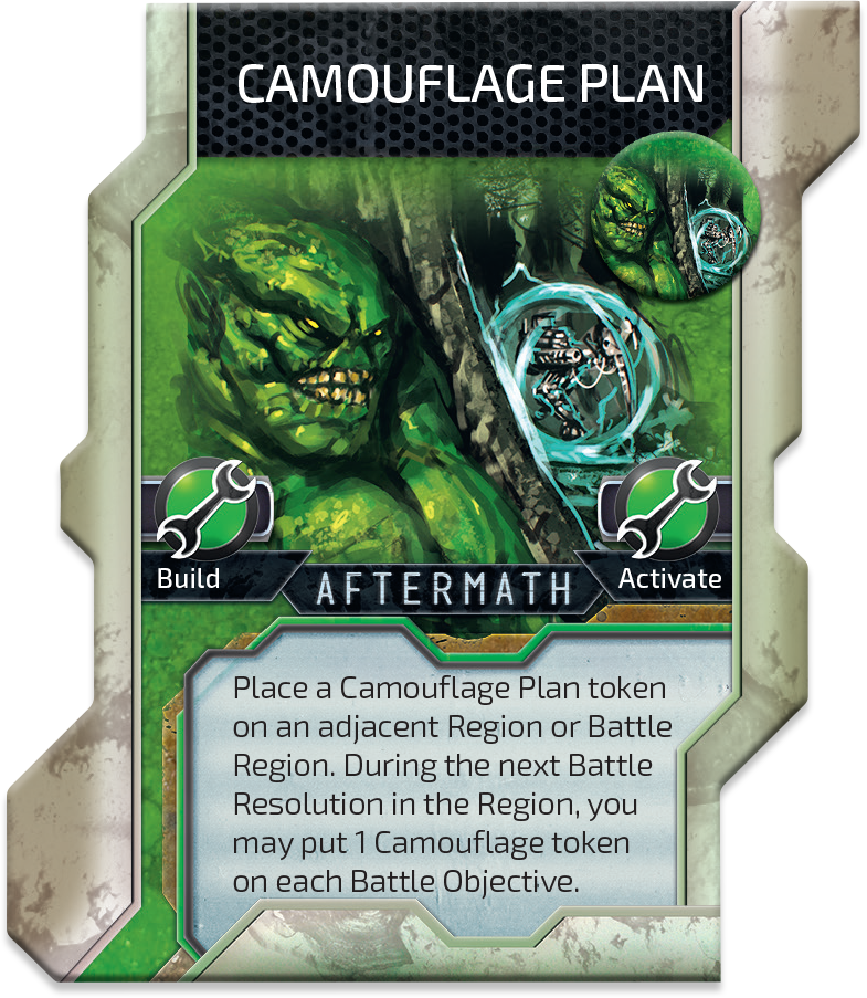 But the best we saved for the end – CAMOUFLAGE PLAN structure. It let you add 3 face down tokens (one for each battle objective) and deceive enemy forces. One of these tokens is worth +1 Unit. Which one? Can you outsmart opponents? We bet you can.