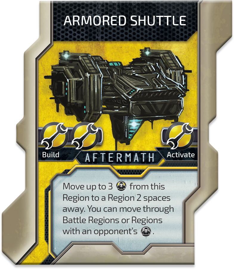 But that is just beginning – we have more in store. ARMORED SHUTTLE allows you to move up to 3 Units to a distance of 2 regions and you can move through Battle regions or regions with other units. You just pack your soldiers into a shuttle, you press Go! and you move no matter who or what is on your way. No more stupid ‘1 unit obstacles’ on your path.