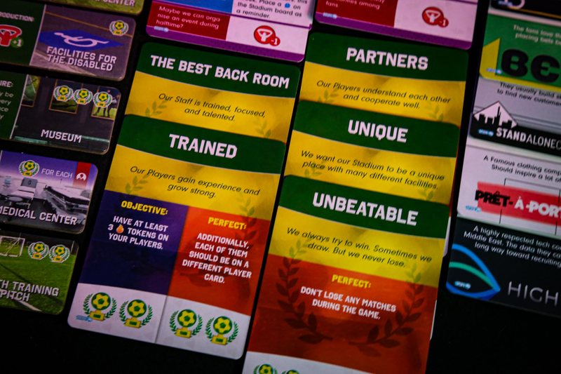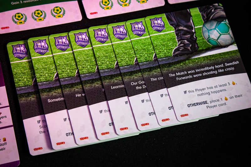 Before Setup, prepare the appropriate Scenario sheet. Your first game is at Brickton FC, then… it depends on your score in each game. Some Scenarios use special cards that are prepared according to the description on the Scenario sheet. These cards are also marked with the corresponding Team Emblem on the back. Some of these cards can give you additional actions that may be performed by fulfilling their requirements.