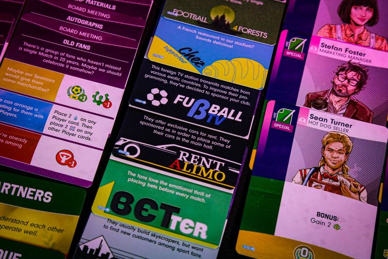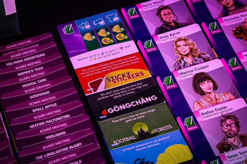 All of the new Stadium Infrastructure tokens are unique, meaning that each one appears only once. Those with the “Special” symbol can only be built when instructed by the Board Meeting cards or Sponsor cards. The remaining Unique Stadium Infrastructure tokens have a cost and effect of their own, just like the other Stadium Infrastructure tokens in the base game. Many of these will benefit you when you check your Production on Monday, such as the Youth Training Pitch card.