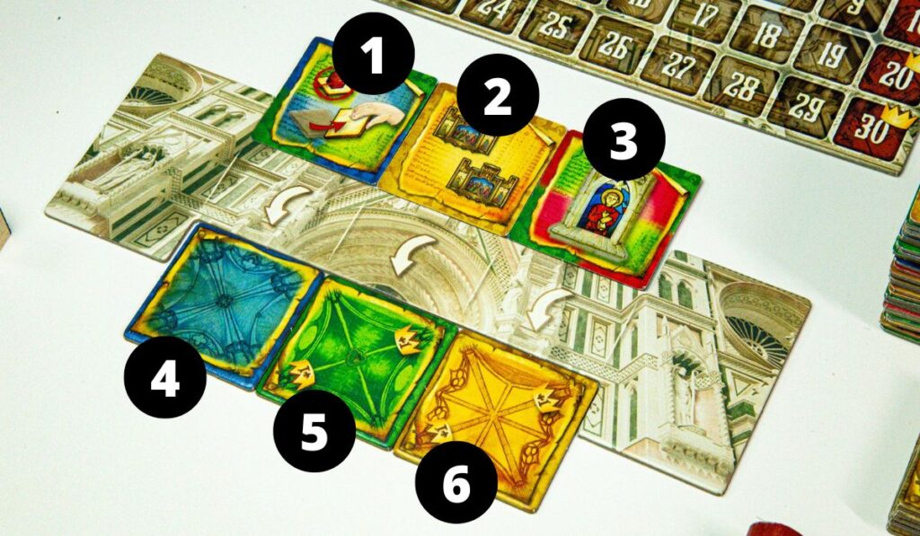 Basilica seems like a classic tile-laying game. With this unexpected twist – it has multi-use tiles. And this one detail adds so many new layers of strategy and tactical joy. Let me show you. Look at this picture.