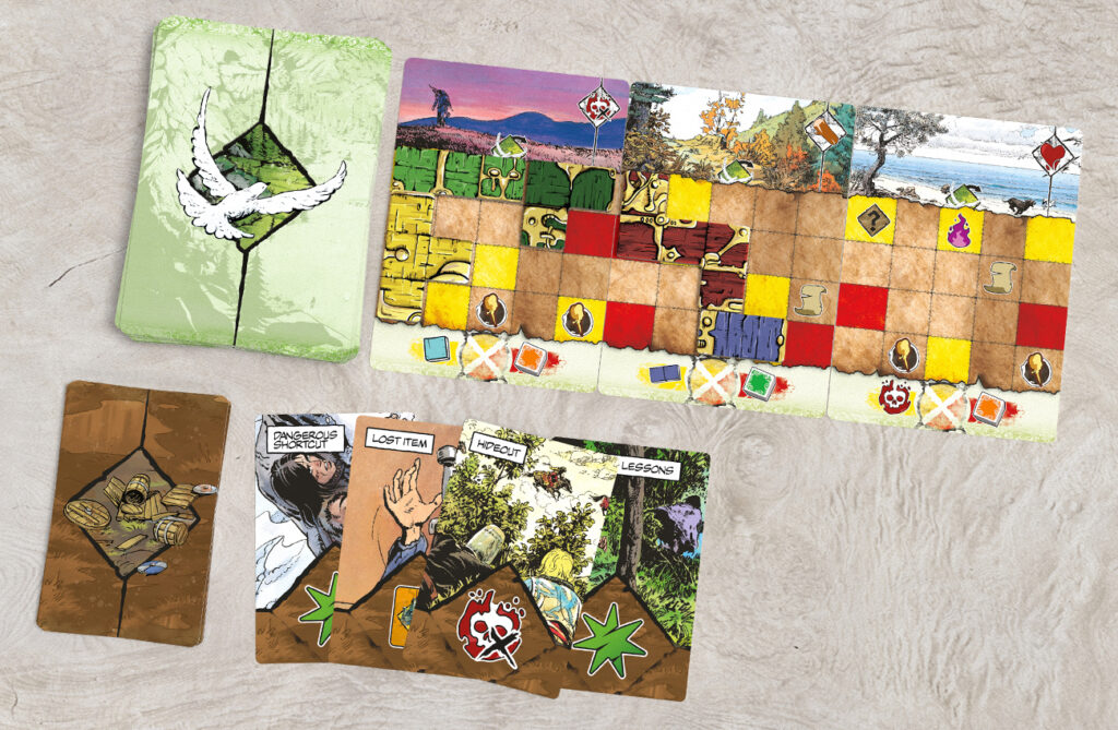 The journey action represents the exploration of a given area, moving within its boundaries, and searching for sources of resources, secrets, rumors, or unique finds. It is represented by a deck of cards on which players will mark the areas they are exploring. Each card contains interesting places where you can find metal, learn rumors, or even have an encounter – represented by the “?” icon.